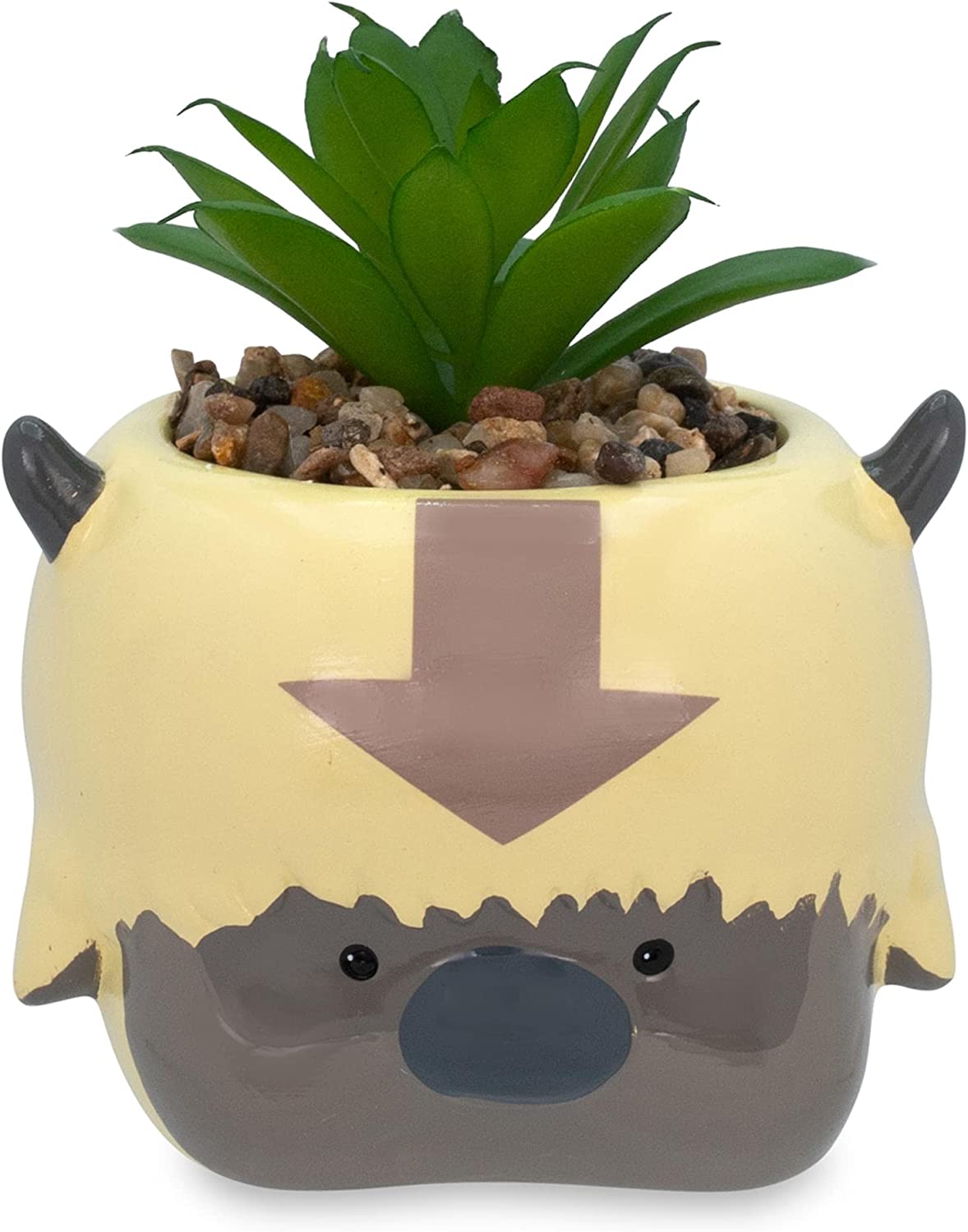 WATER. EARTH. FIRE. AIR. Become the world's greatest plant bender with this exclusive home décor collectible from Avatar: The Last Airbender. Modeled after the legendary flying sky bison, the impressive ceramic sculpt reimagines Appa in adorable chibi detail right down to the arrow-shaped patch of fur on his head. This decorative home essential will have you reliving all your favorite moments with the gang. WHERE ATLA FANDOM MEETS DECORATIVE HOME DECOR Whether it's exploring the Four Nations or just a walk to the kitchen, Appa will make every moment feel like an adventure. This charming planter pot includes an artificial succulent for a simple way to refresh your home. Display this beloved companion on your windowsill, mantle, or wherever you need a little "Yip! Yip!" action to spruce up the place. Adventure awaits with officially licensed home décor from Avatar: The Last Airbender.