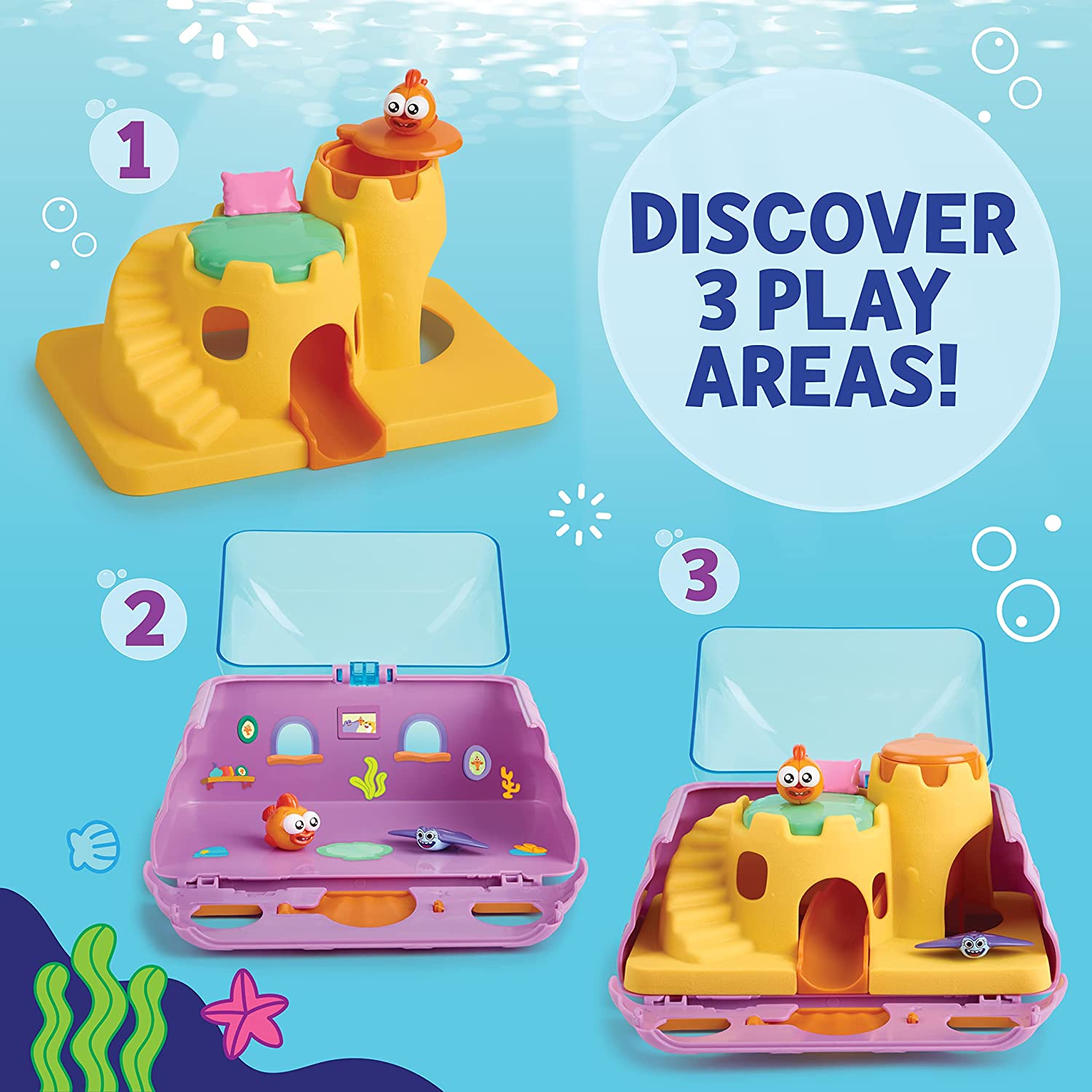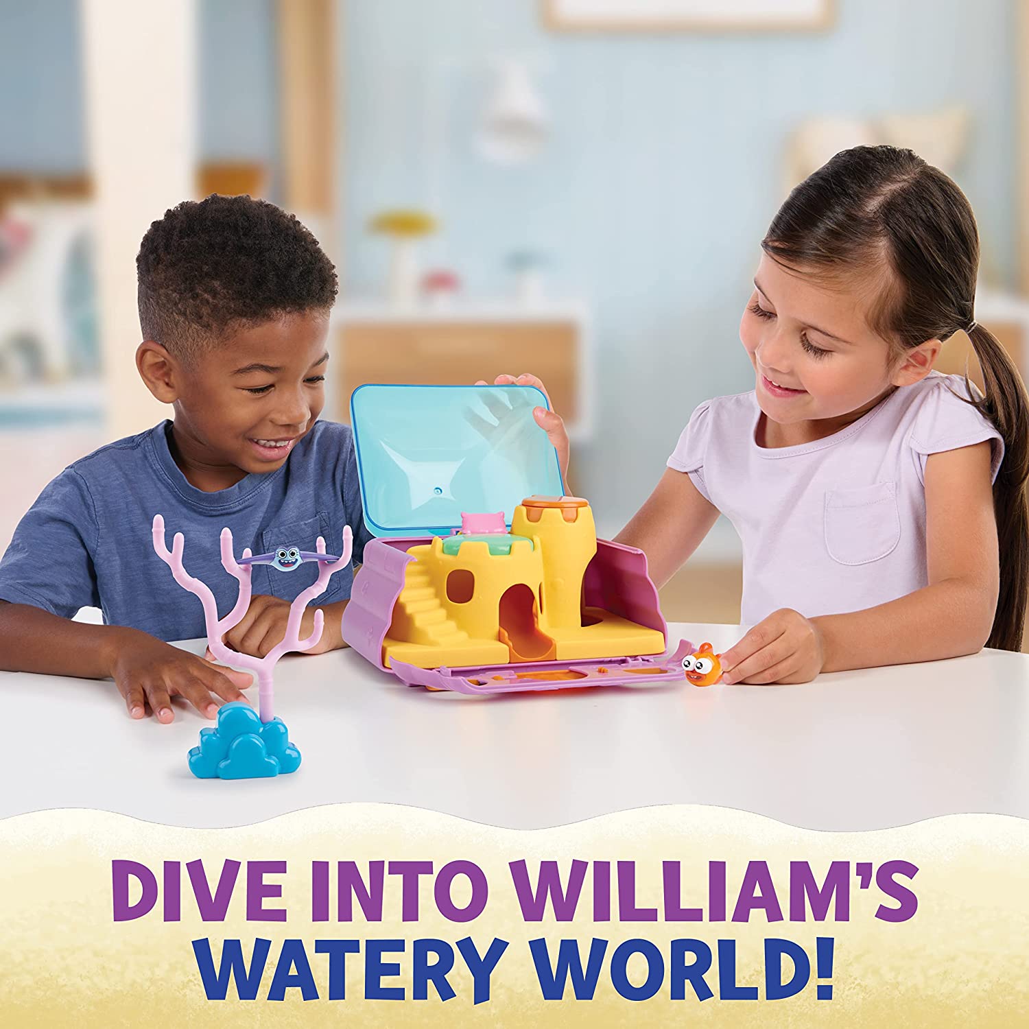 DIVE INTO WILLIAM’S WATERY WORLD! Discover three play areas inside this playset: William’s House, Sandcastle, and William’s Living Room! Kids can swim, slide, and climb from room to room as they play pretend with the toy figures.