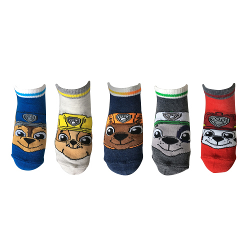 This Paw Patrol sock assortment comes with 5 pairs of socks. Each pair has a character, along with the characters first initial on the side/bottom. The characters featured are Chase, Rubble, Zuma, Rocky, and Marshall