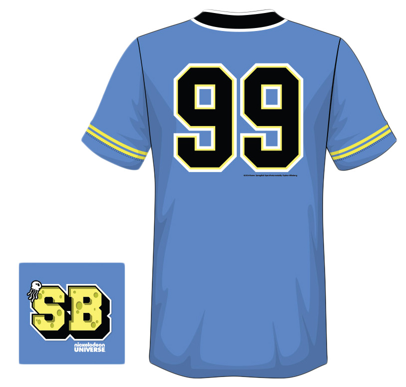 It doesn’t get more in-your-face than this! One half of this jersey is SpongeBob’s happy face, the other half is classic Nickelodeon blue. Add in retro-style sleeve stripes, the SB patch, and a bold “99” on the back — this jersey is a celebration of SpongeBob’s first-ever episode in 1999..